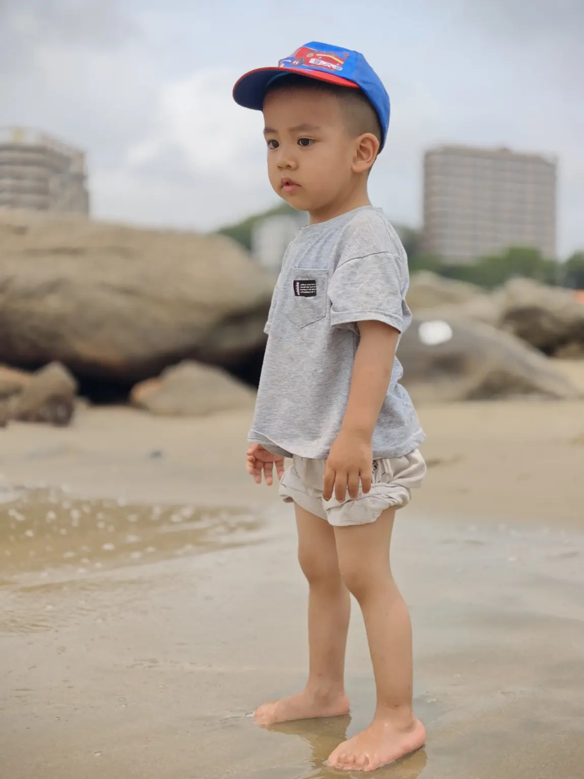 第二站,海边踏浪!小家伙光着脚丫踩在沙滩上,吹着海风,戴着小帽子,那小模样帅得我心都化了。看着娃在沙滩上追着浪花跑,我终于明白:什么叫「电量满格,快乐就满格」!
