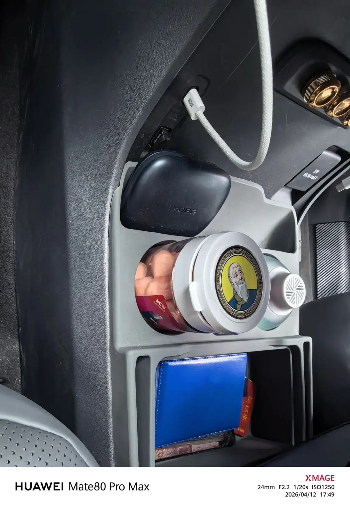 原车的G7中控是“裸露”直接的,没有任何的归档之类的地方,于是网上买了一个中控储物,几个储物功能:①把蓝牙耳机放里面,可以在车上有其他乘客的时候隐私电话不被干扰。②开车喜欢吃的小零食,有圆形的储物盒就可以方便去拿的同时不会跑来跑去。③空气清新的盒子也可以放进去不会动来动去。④抽纸固定放在后挡处,方便拿取。⑤抽纸下面是可以提起来的,里面是驾照和行驶证,平时不需要拿出来但是交警需要查验的时候随车带着,而且平时有东西压上面也更安全。