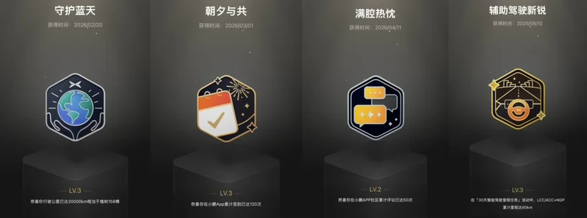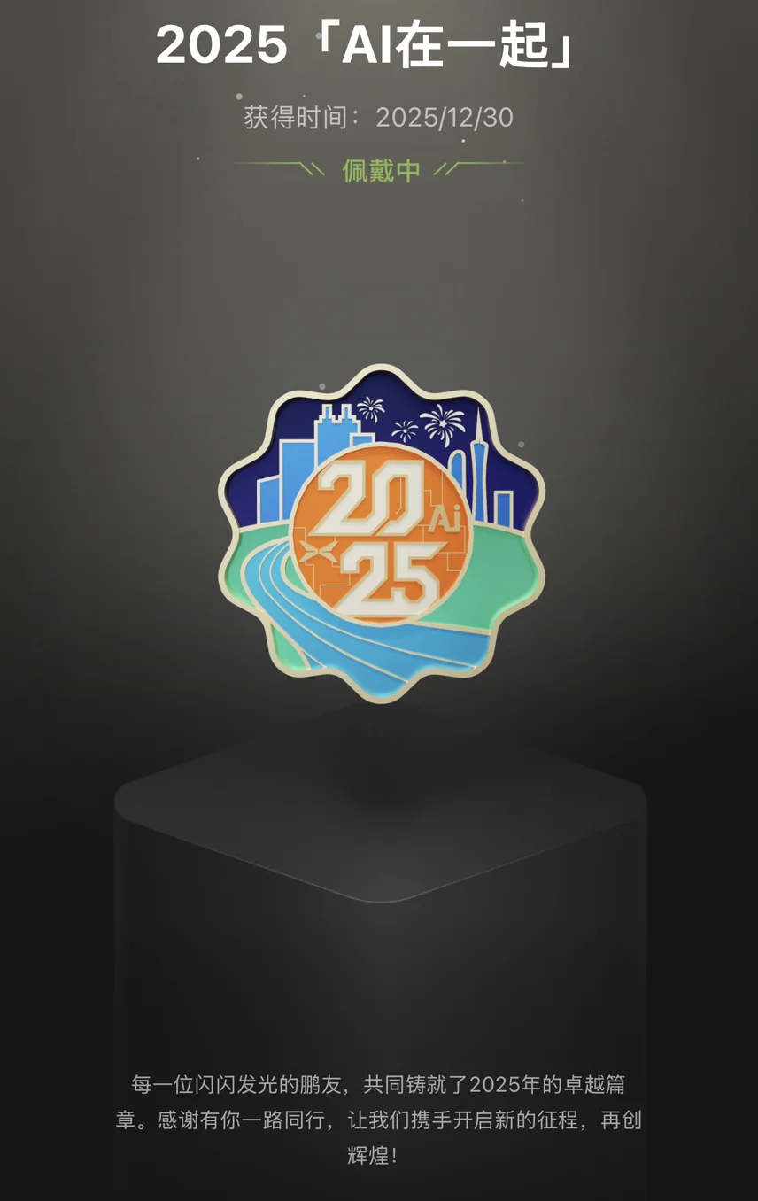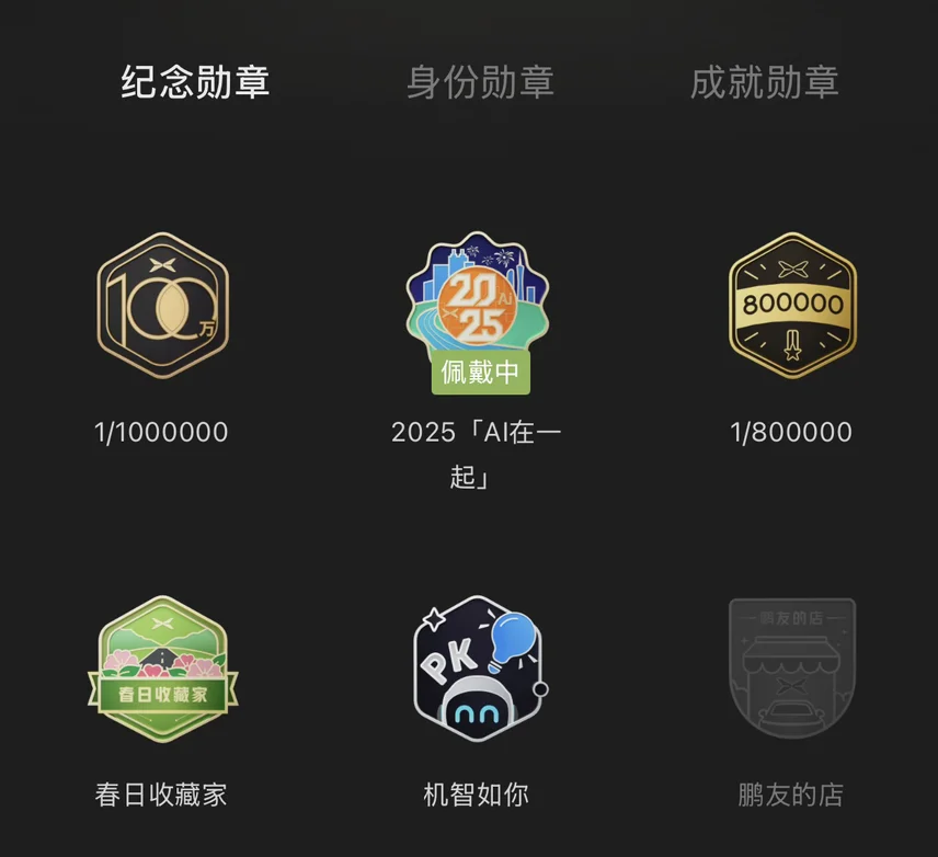 • 日常常戴勋章:2025「AI在一起」,不管是社区主页还是个人主页,一直戴着它,时刻纪念一整年的AI智趣陪伴,也彰显自己小鹏车主的身份。