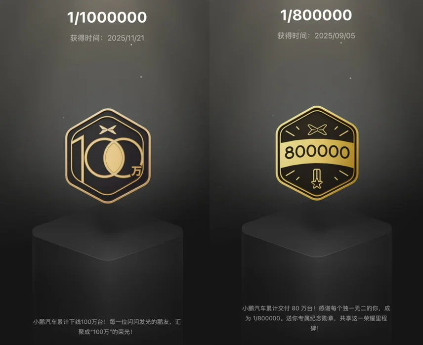 作为亲眼见证小鹏从80万到100万车主突破的一员,这两枚沉甸甸的金色勋章,是我所有勋章里最珍视、最骄傲的收藏。