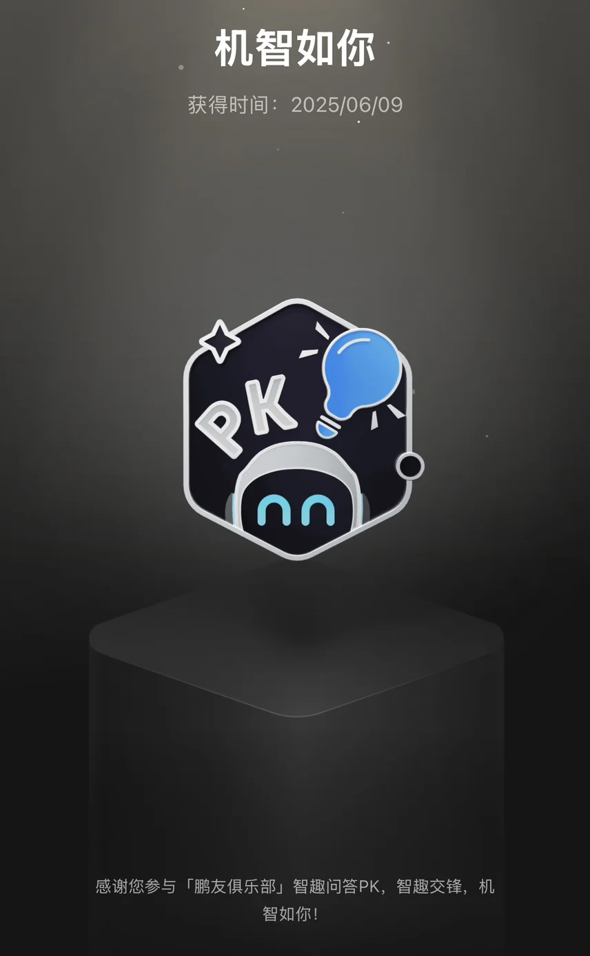 2025年6月9日解锁的「机智如你」勋章,是我参与鹏友俱乐部智趣问答PK赢来的奖励。