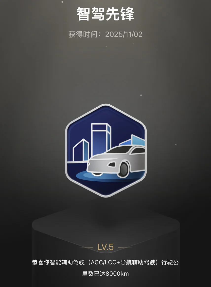 2025年11月2日,我的智驾先锋等级成功升到LV.5,累计智驾里程直接突破8000公里!