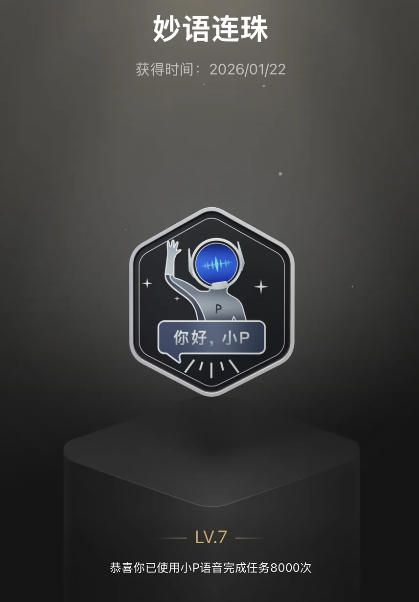 必须好好炫耀一下,我的妙语连珠等级直接冲到LV.7,累计使用小P语音完成各类指令超8000次!