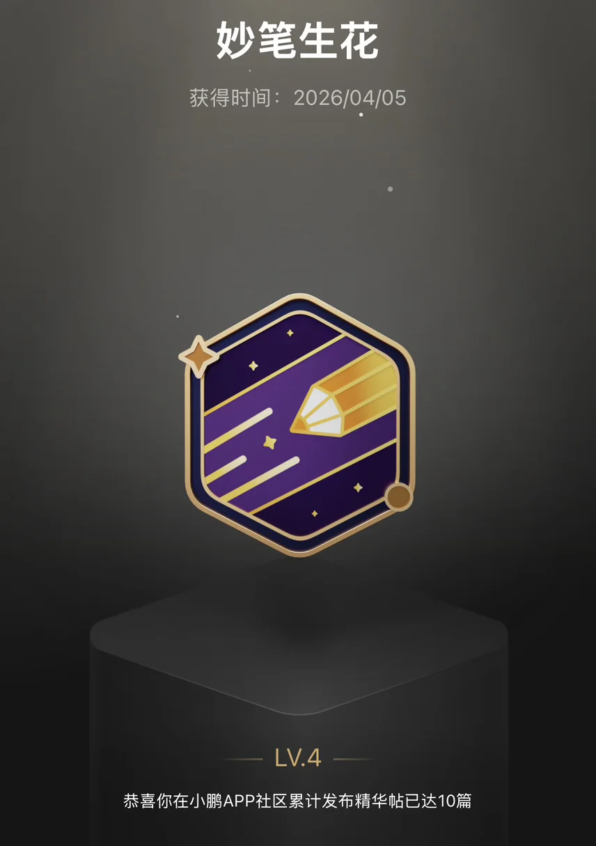 2026年4月5日,我成功解锁妙笔生花LV.4,累计在小鹏社区发布精华帖10篇,收获了无数鹏友的点赞与互动。