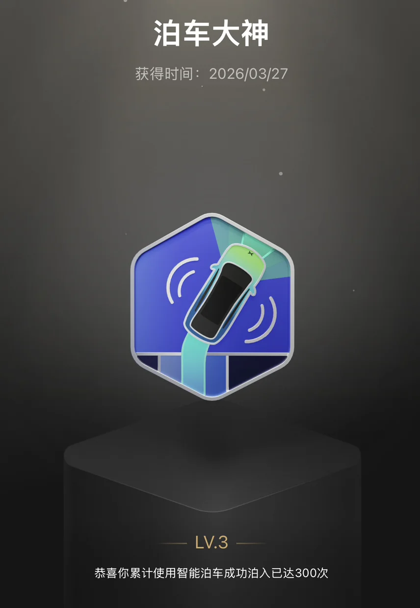 2026年3月27日,泊车大神等级升到LV.3,累计使用智能泊车功能成功泊入300次!