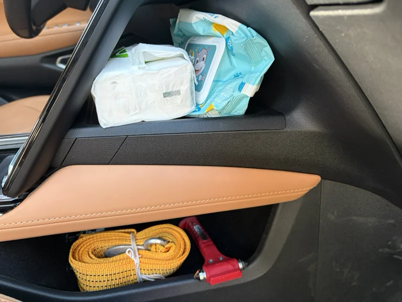 👉中屏后两个隔断分区明确,一边放纸巾、湿巾,日常取用方便,一边收纳玻璃锤、拉车绳,应急有备无患。