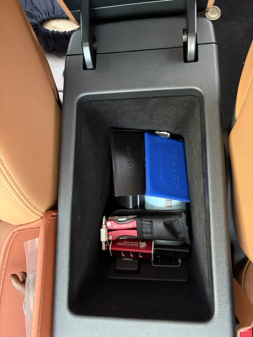 👉扶手箱专属存放行驶证、驾照,搭配音乐U盘与香包,证件齐全、香气随行。
