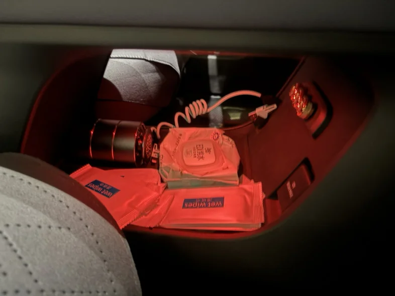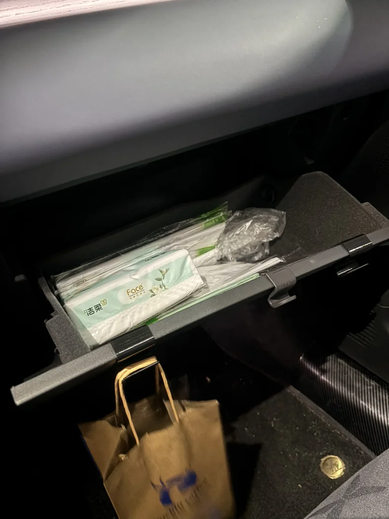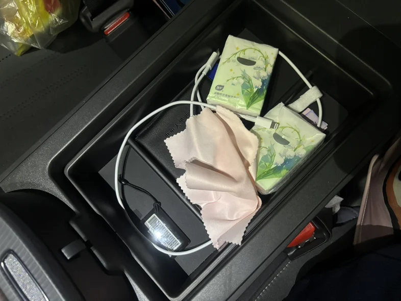 我给这里铺了分隔垫,把湿巾、香薰和随身小物分类摆放,拿取方便还不异响。这里既是杂物仓,也是存放小确幸的宝藏格,每一程都充满格调!