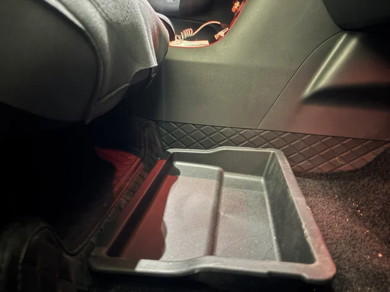 座椅下方原本是个容易积灰的死角,被我网购了这个TPE储物盒完美盘活。