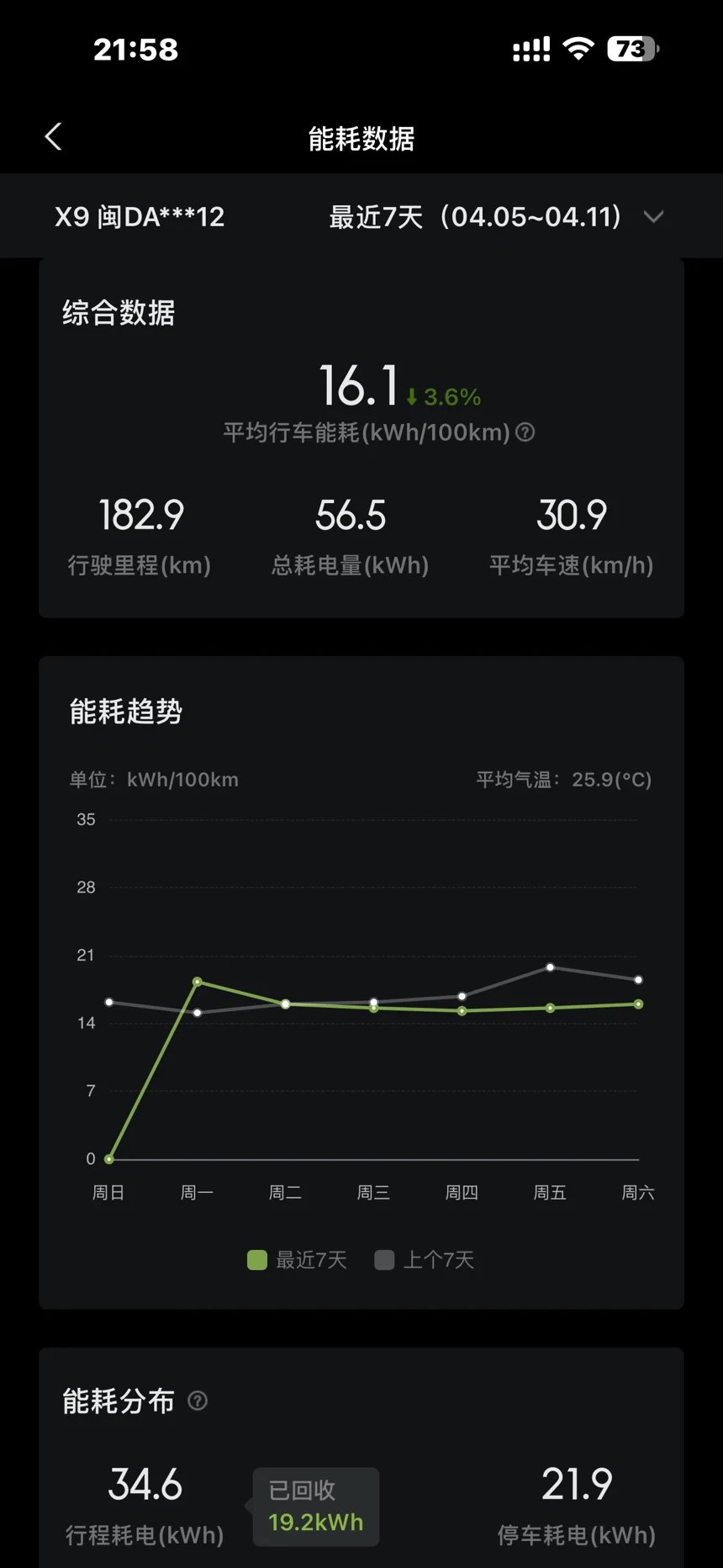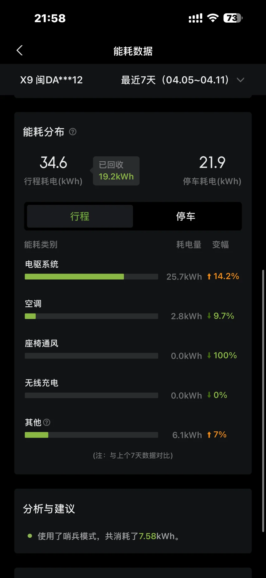 • 动能回收调至中高挡,红绿灯前提前松电门滑行,一周就回收了19.2kWh,相当于白捡了一段路程的电量!