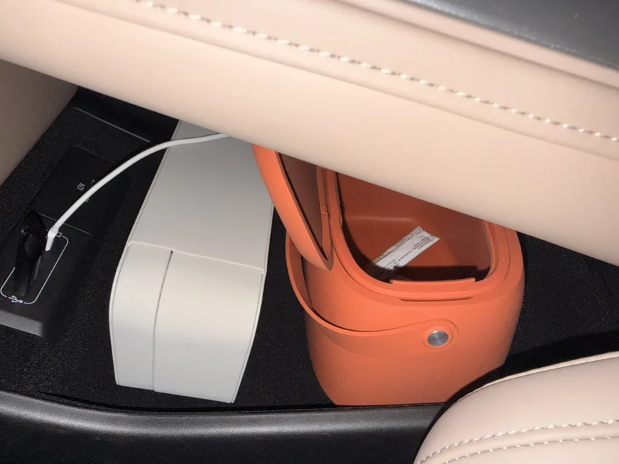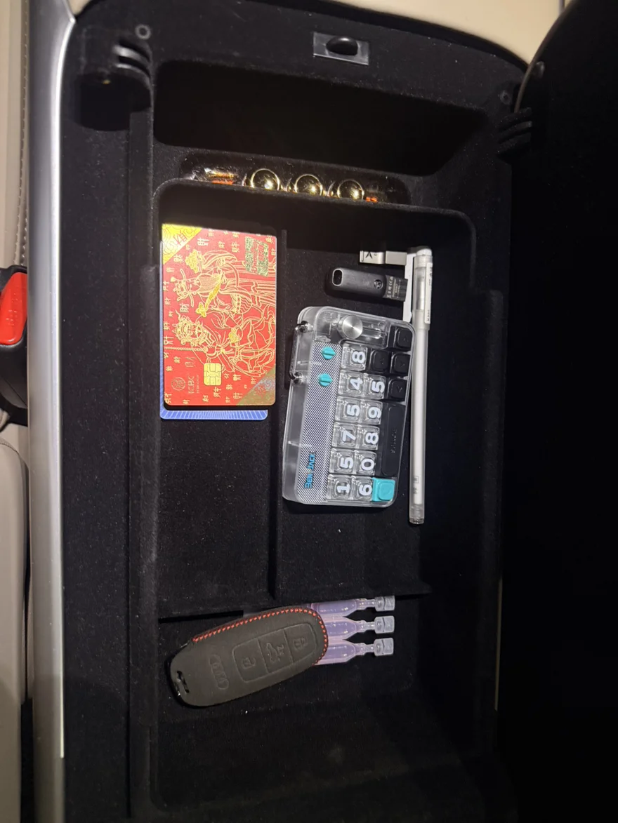 深度非常惊人,竖着放进两瓶500ml矿泉水后,上方仍有空间放票据、行驶证。内部还隐藏了一个空调出风口,夏天开冷气时能充当简易小冰箱,给饮料降温。建议加个分层储物盒,避免大件翻找的尴尬。