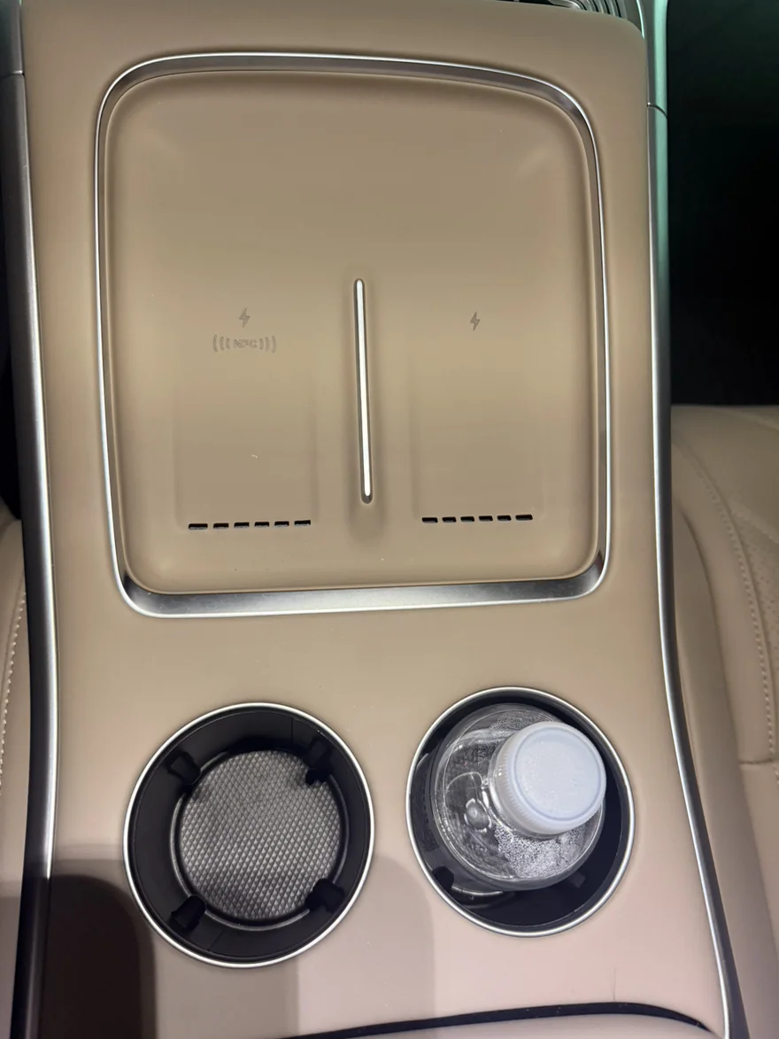 标准的两个带限位器的杯架,直径够大,能稳定卡住奶茶杯、咖啡杯或粗柄保温杯。杯架前方是一块带通风的手机无线充电板,支持快充且防滑。行车中手机不会乱飞,细节好评。