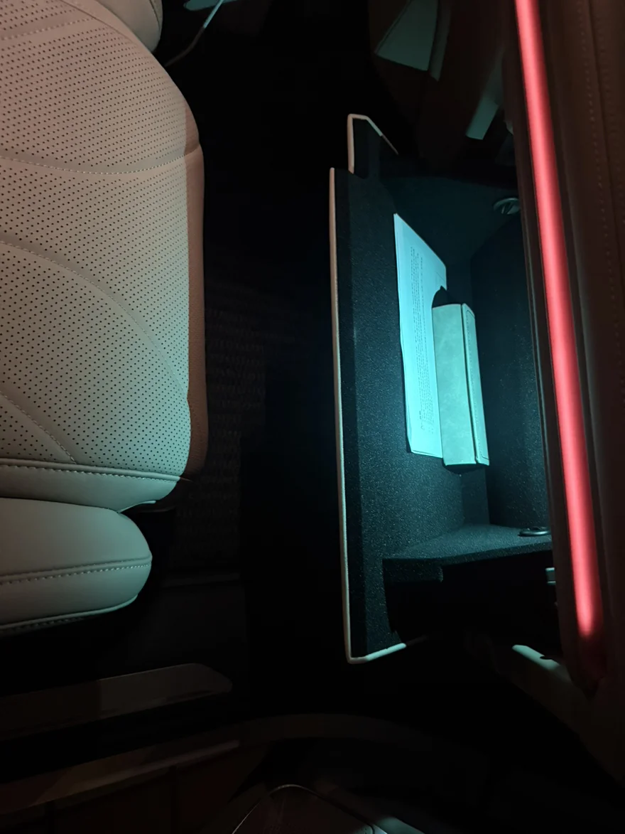 常规状态下,同时放四个24寸托运箱和两个20寸登机箱毫无压力。后排座椅支持4/6比例电动放倒,放倒后几乎纯平,铺上充气垫就是一张双人床。盖板下方还有一层隐藏储物格,补胎液、充气泵、三角牌等工具整整齐齐,不占主空间。另外,右侧壁龛还专门配了一个网兜,灭火器或玻璃水不会在转弯时乱滚。