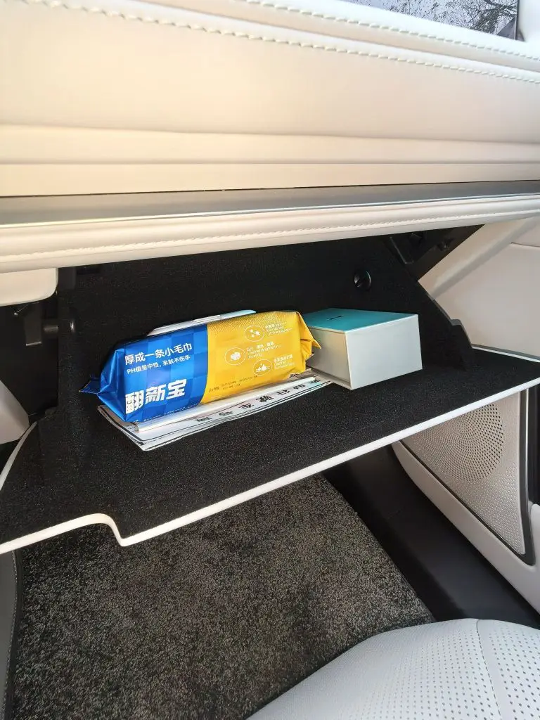 - 副驾手套箱:收纳车辆证件、露营攻略、清洁湿巾,还有孩子的备用文具,分类摆放,一目了然。