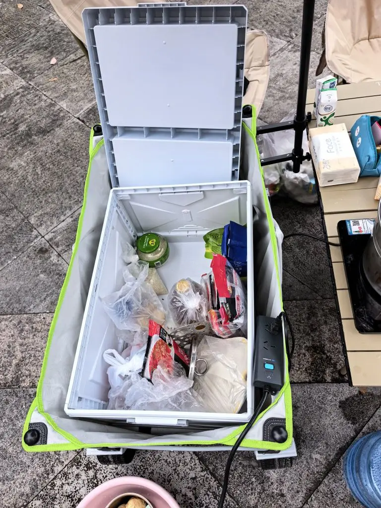 - 底层固定区:左侧放充气床垫,随时可以秒变床车,长途自驾孩子累了就能躺平休息;右侧固定一个大容量保温箱,专门存放饮料、生鲜和露营餐具,分区隔层设计让拿取超方便,再也不用翻找半天。