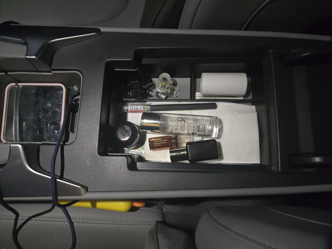 ▫️扶手箱做了上下分层设计,收纳力直接拉满!下层归置重要证件、香水、充电器和日常杂物,上层专门塞各种护肤品小样,随手就能用,通勤补妆超方便!