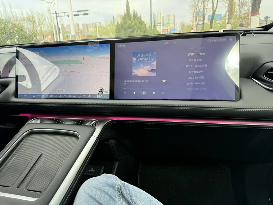 等红灯的间隙,点开音乐软件,随机播放一首喜欢的歌,歌词在屏幕上滚动,旋律顺着20个扬声器流淌进座舱的每个角落,连堵车都变得没那么难熬了。