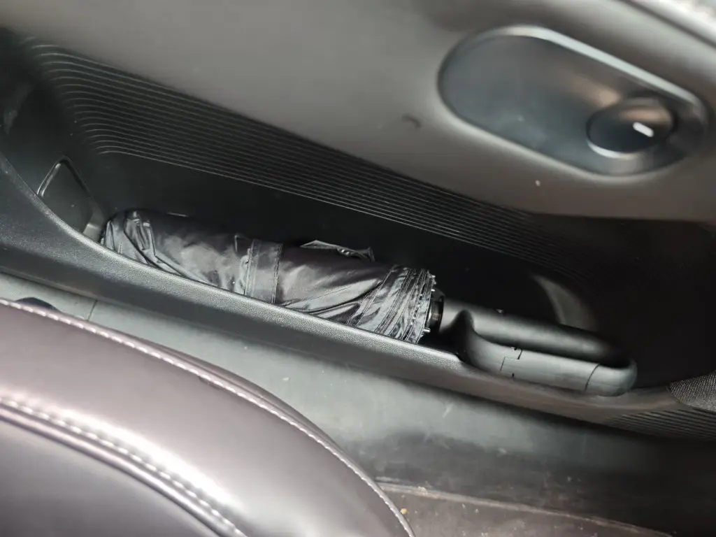 ①门把手小空间。门把手处和门板下方以及充电区域下方是很好的储物点,放钥匙、放雨伞都非常合适,需要用时拿起来也很方便。