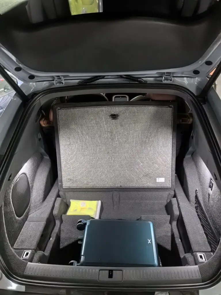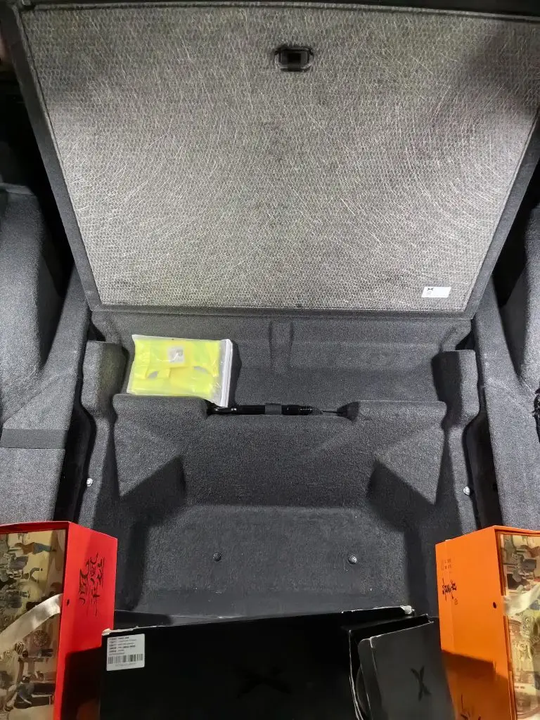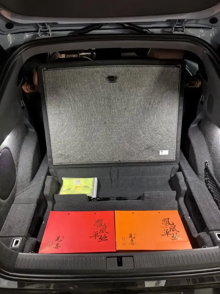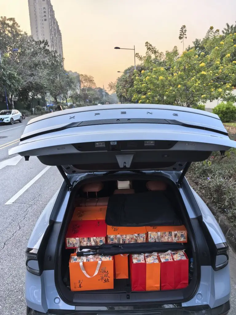 有一次要把近30盒茶具礼盒全部塞进车里。里里外外、边边角角全用上了,下沉箱也塞了两盒(再多怕压皱礼盒)。看着满满当当的后备箱,突然觉得小鹏像一位靠谱的“事业伙伴”——能装,也能温柔对待每一份心意。