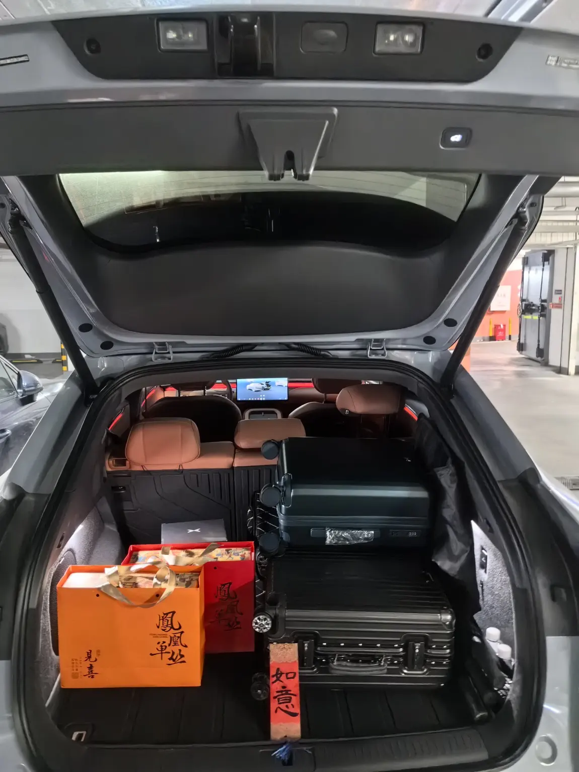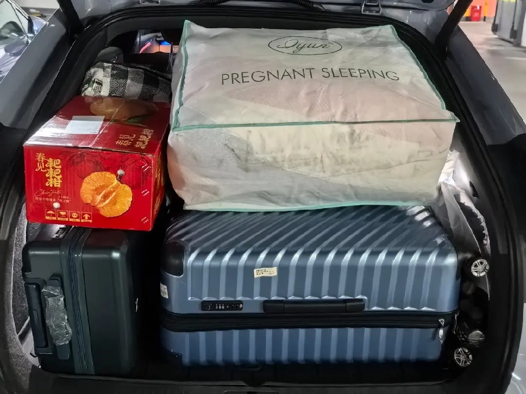 28寸+20寸行李箱,露营床垫、被子、储物箱、礼品……连下沉箱都塞得满满当当。但关上后备箱的那一刻,心里不是“好重”,而是“好暖”——每一件,都是对家的奔赴。