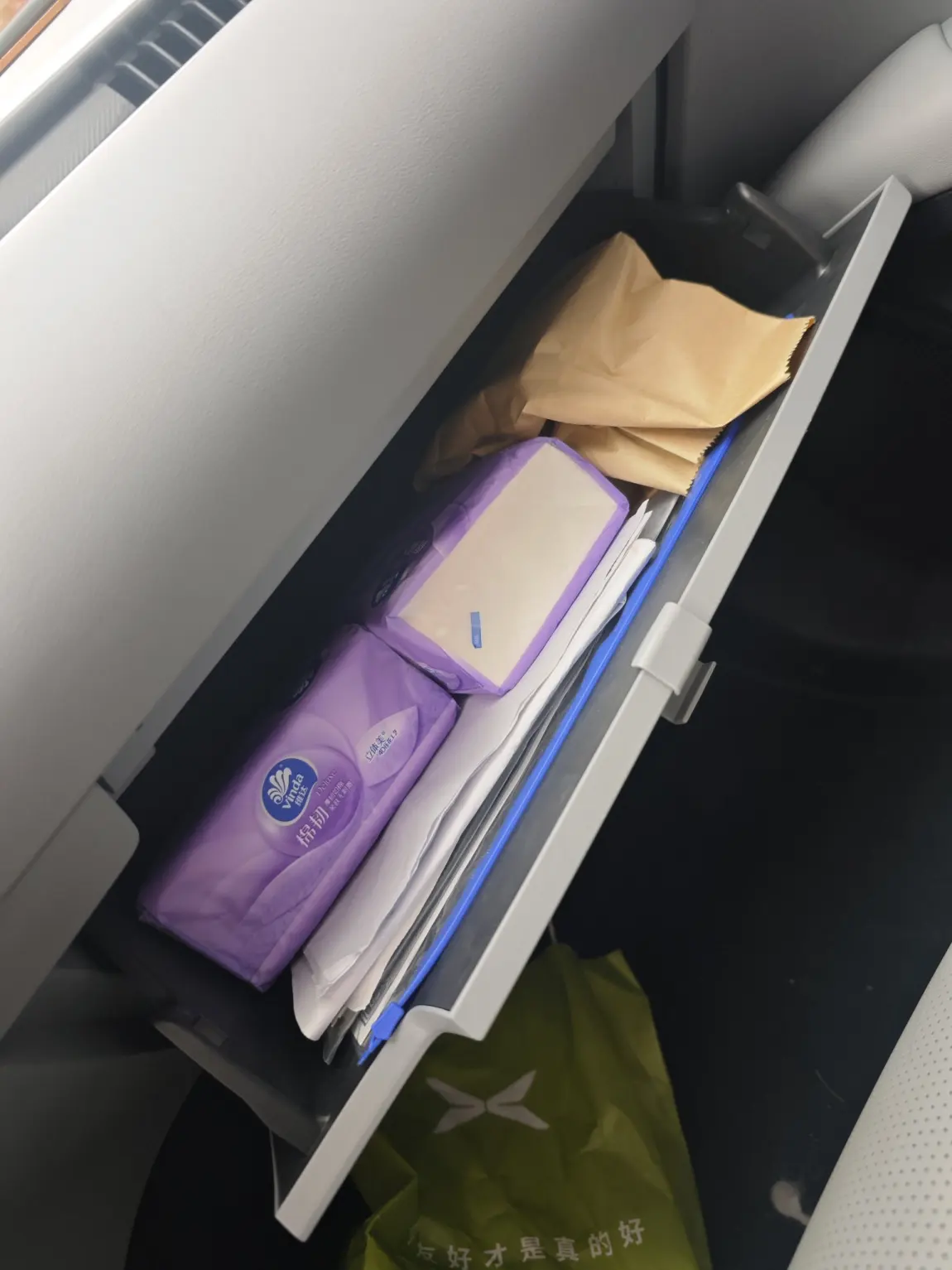 第二个就是副驾箱,多东西把,其实都是实用的,纸巾不说了,还有就是各种证件,最后还是说牛皮纸袋,这个是装了广东红包的,去哪里都可以用。😊