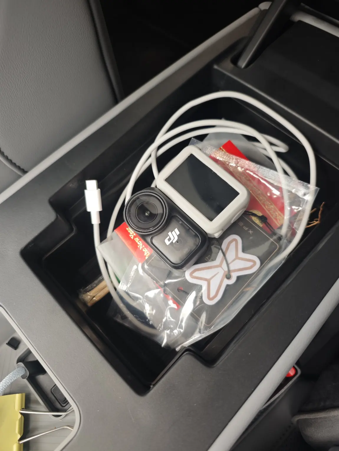 然后扶手箱,这里就厉害咯装了超多东西,一个就是商城买的nano,大疆的随时随地拍,其他的就是香薰和充电线。下面就是钥匙了,一直都没装满。