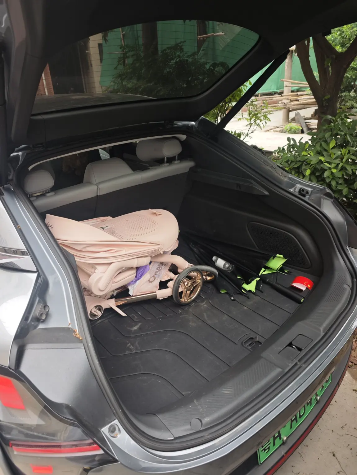 后背箱就是我宝宝的推车收纳箱,大家看到帐篷吗,后备箱下面还有放了一个大帐篷,超能装的。然后就是小鹏的雨伞也是很好用的