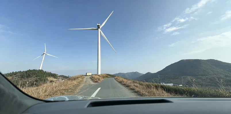 路过山顶,巨型风车在云端缓缓转动,与蓝天山野相映成诗。在车内感受着巨大风车的震撼,一切都显得那么的梦幻。