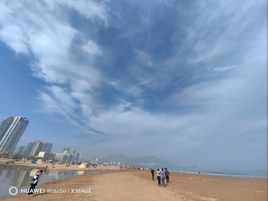 抬眼望去,蓝天与碧海在远处相融,流云如轻纱般漫过天际,远处的城市建筑错落排布,与海中的礁石相映成趣。沙滩上的行人或缓步散步,或驻足拍照,孩子们追逐着浪花,笑声清脆得像海边的风铃。海风轻轻卷起衣角,吹散了所有的疲惫与烦躁,只留满心的安宁。