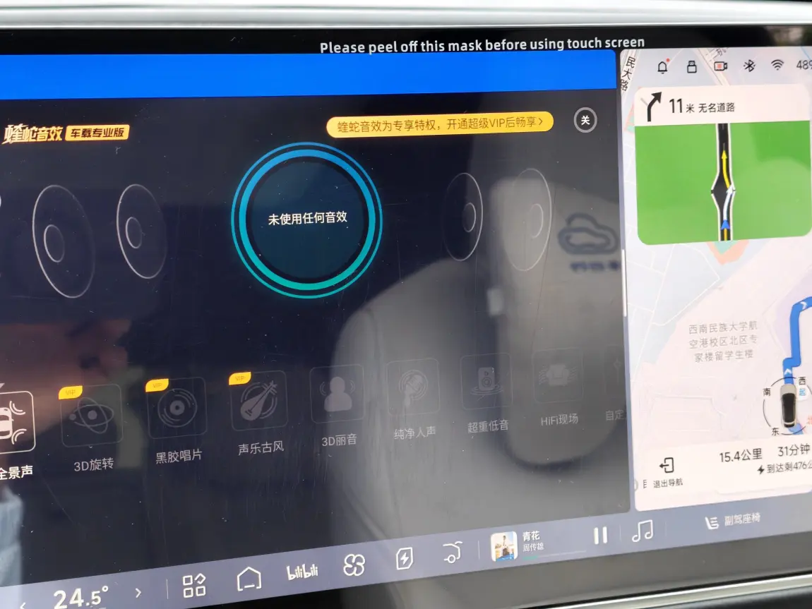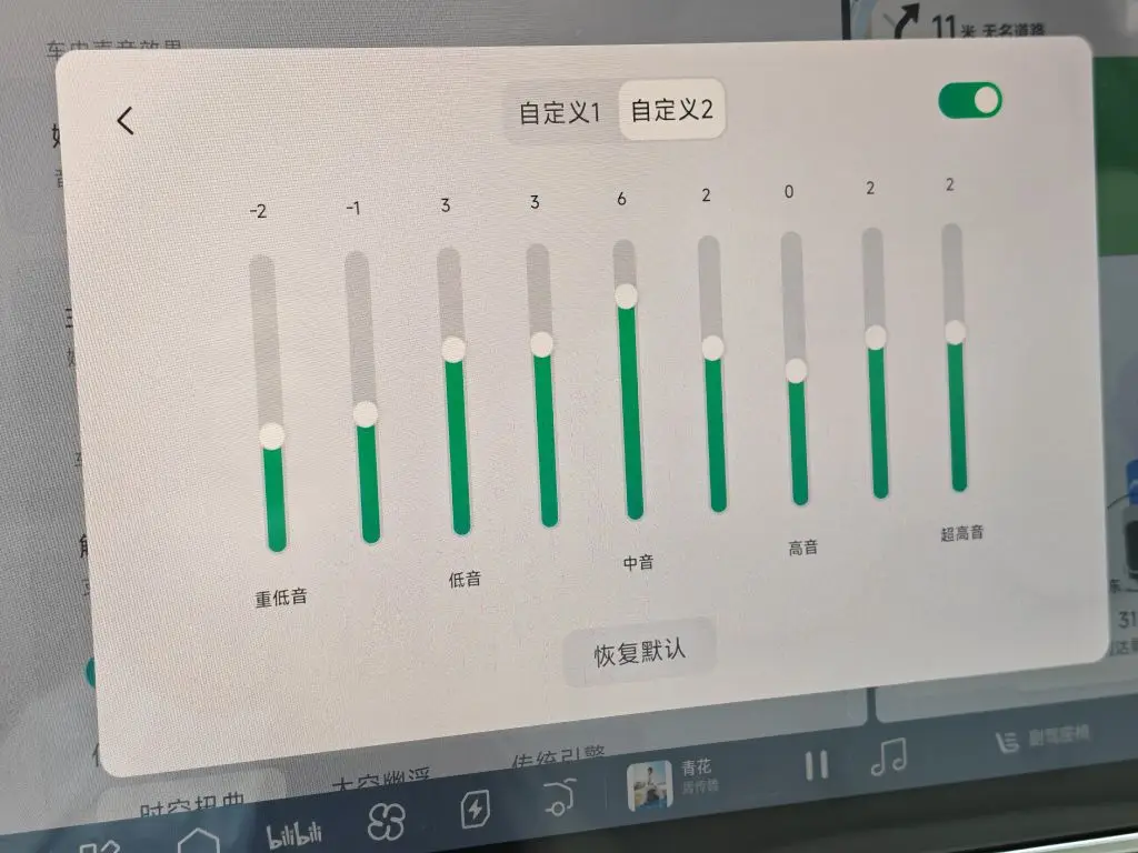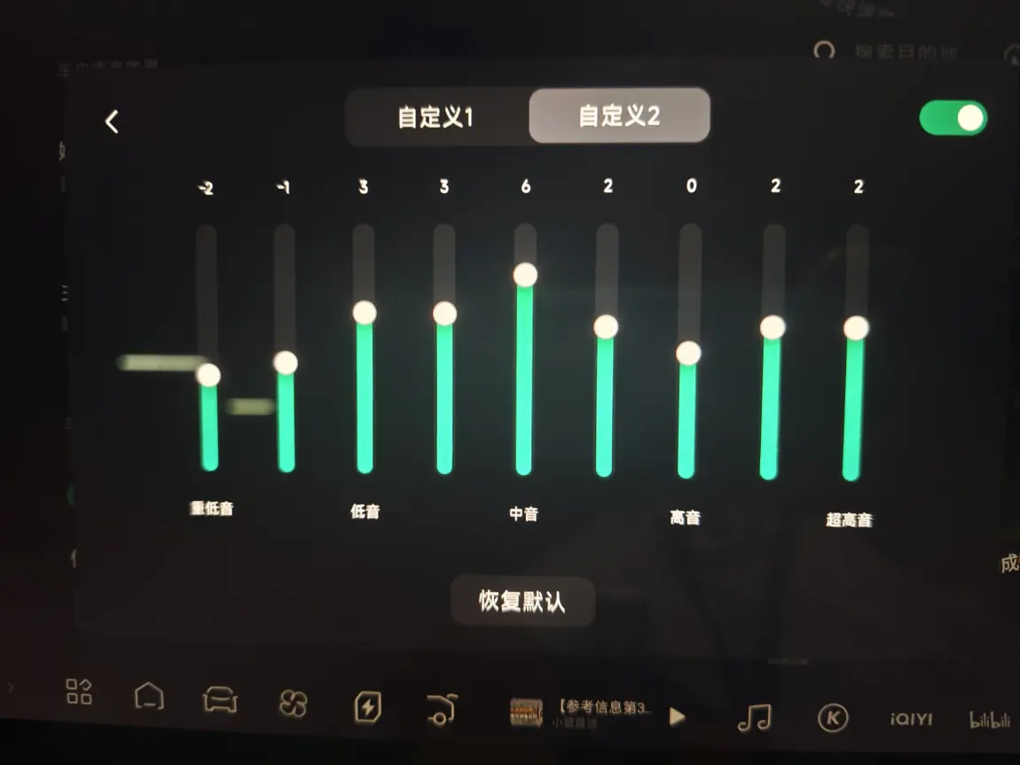 - 空间音效:开「中」档,既不会太闷也不会太散,全车都能有沉浸感