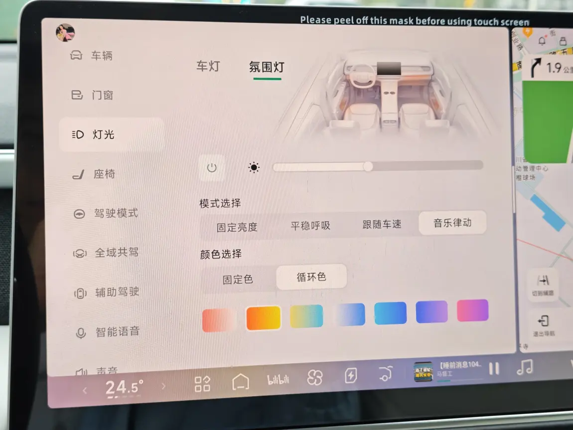 - 颜色选择:我用的是「循环色」,七彩渐变跟着音乐变换,开车的时候看着灯光跟着旋律闪,心情直接起飞