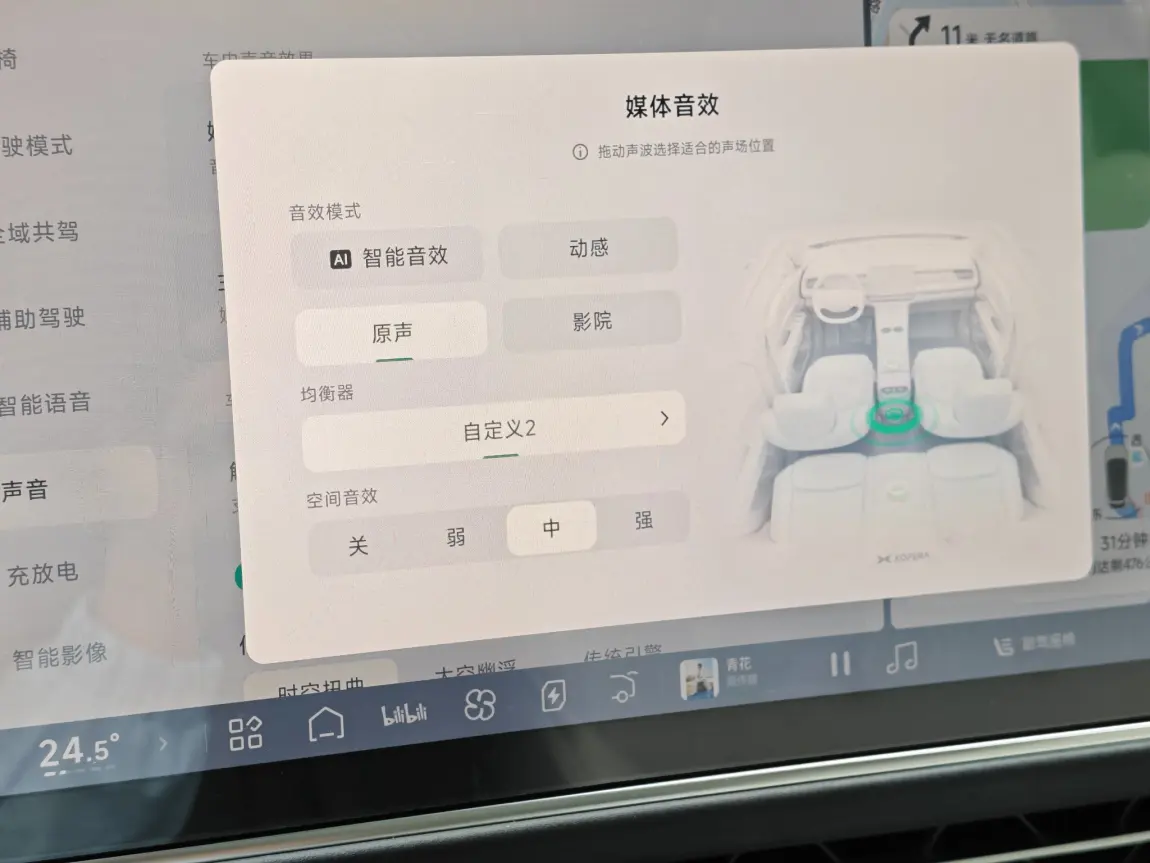 - 声场位置:默认全车居中,主驾听歌可以微调主驾位,副驾有人就切全车,很灵活