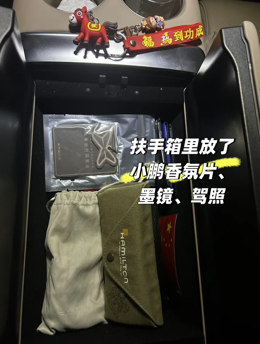 中控扶手箱里放墨镜、驾照、还有小鹏送的香氛片,摆一本书,等人的间隙可以翻两页书打发时间,独处时光也能慢悠悠治愈。