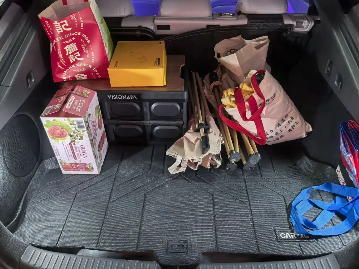 小鹏P7+最大的优点就是他的超大后备箱,我的后备箱日常都会放一袋小零食和一箱小饮料,平时也喜欢出去自驾游露营,所以野餐垫,一张折叠桌和两张折叠椅外加一个收纳箱都是车内必备的,就算是已经装了这么多露营装备,但是后备箱还空了一大半,这样就省得我把露营装备拿回家又拿出来了,时时刻刻准备着,看到路边的好风景都可以停下来坐坐,旅行路上再也不留遗憾。