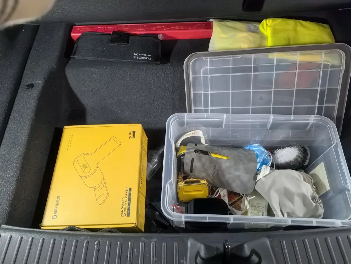 除了明面上的后备箱储物空间,后备箱盖板下面还有个隐藏,我一般都是放上平时用的少的洗车工具和随车便携式车载工具比如放电枪,插座和便携充气泵等,别看空间不大,放两个20寸小储物箱还是没问题的。