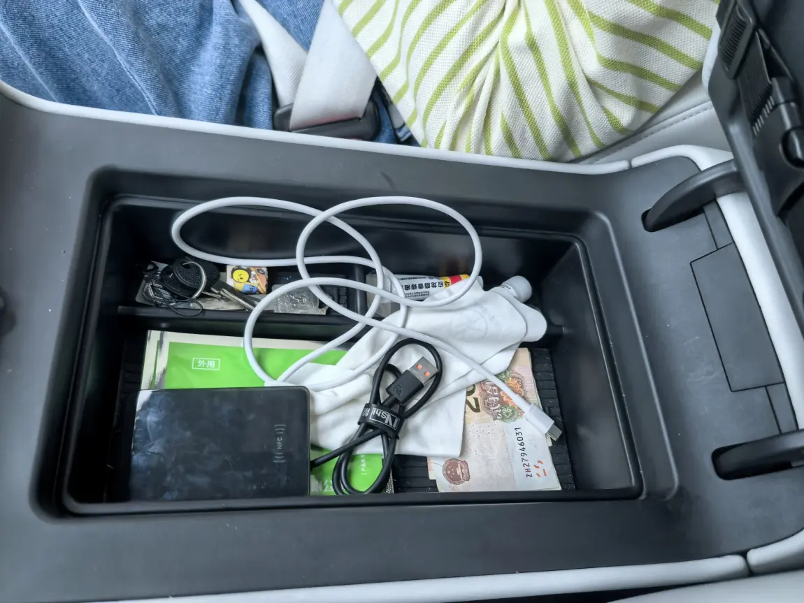扶手下的储物盒被我用商城买的隔板,一分为二了,上层用来放钥匙,硬币,零钱,数据线等小物件。