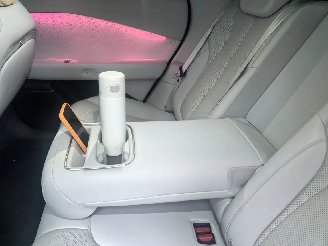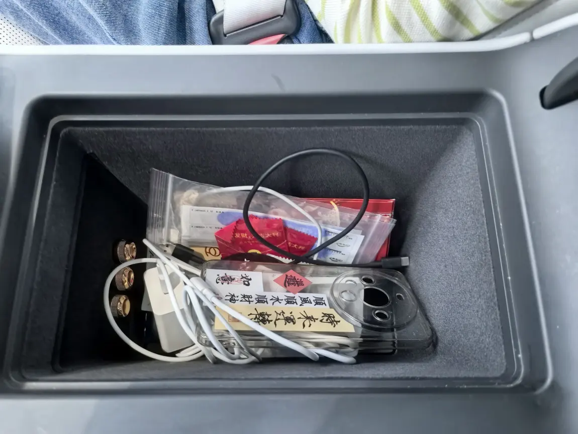 我们前后排的扶手处都可以放两部手机,两个杯子,这边还有一个建议,就是被套处能否设计成一杯一洞,中间不要联通,因为中间打通的话高杯子很容易向一侧翻倒。