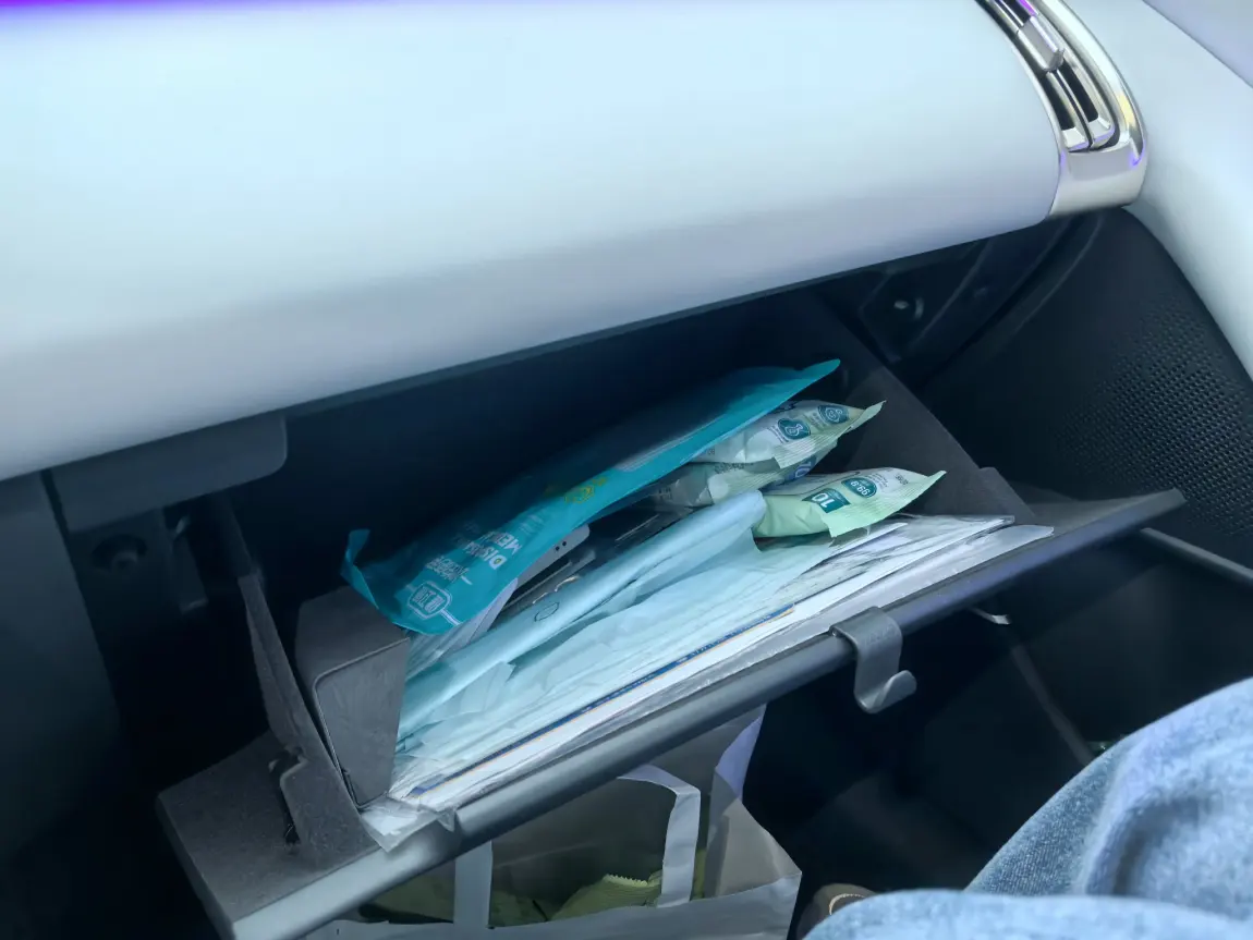 副驾手套箱我猜大家放的东西应该都差不多,我们提车时的所有纸质材料应该都放在了这里,大小正合适,然后还会放抽纸口罩湿纸巾这些日用品。