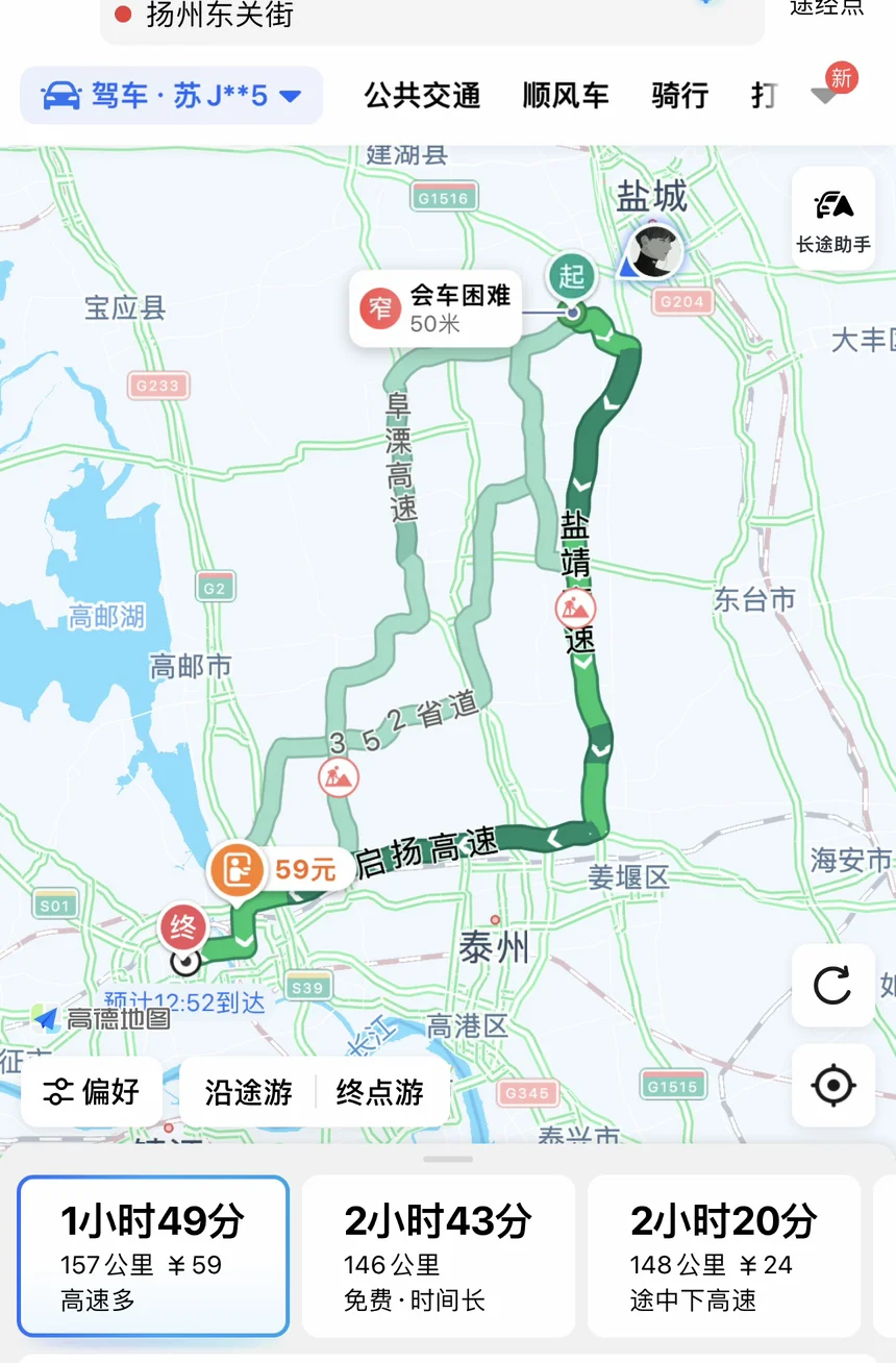 导航设定好扬州东关街的路线,车辆平稳驶上高速,小鹏G9的智能辅助驾驶系统让长途行驶轻松自如,从而缓解早起的乏意。