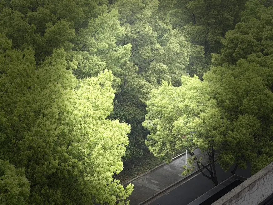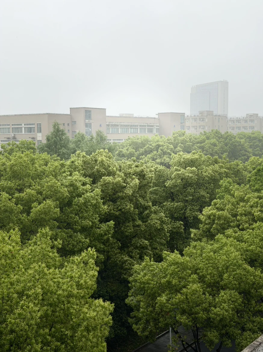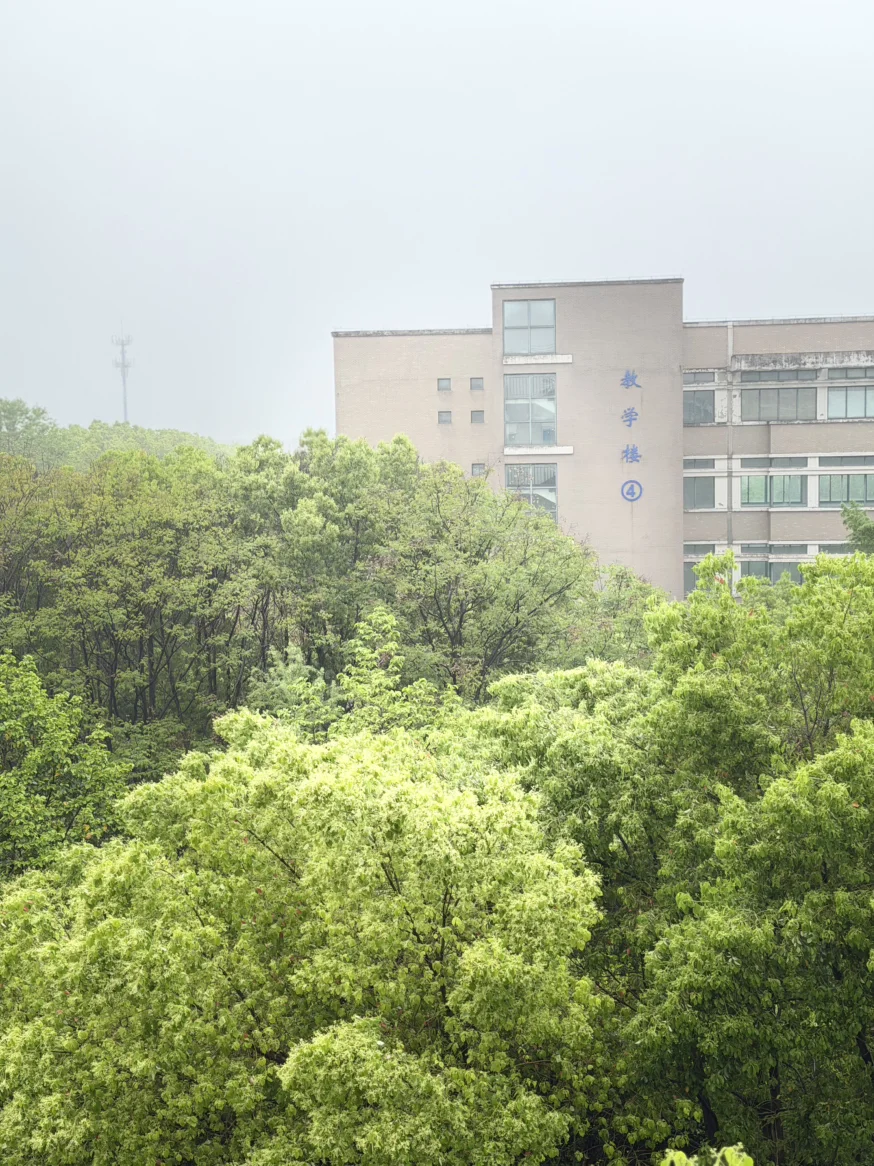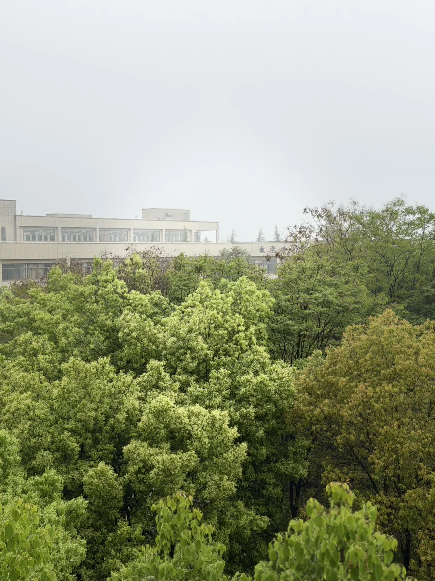 绍兴的春雨,总带着江南独有的温润,像一层薄纱,轻轻笼住了校园的每一寸角落。站在教学楼的窗前望去,漫山的香樟与新绿在雨雾中舒展,深浅不一的绿意层层叠叠,从脚下一直铺到天际。远处的教学楼在烟雨中若隐若现,“教学楼”的蓝底白字在朦胧里晕开,成了春日里最沉静的注脚。