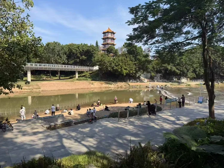 午后阳光渐暖,我们带着雪球沿龙岗河漫步。河水澄澈,岸边垂钓的市民悠然自得,空中廊桥横跨河面,与远处的宝塔相映成趣。雪球踩着松软的草地,时不时低头嗅嗅花草,遇到小水洼便小心翼翼绕开,生怕溅湿绒毛。遇到同行的小朋友,它会轻轻蹭蹭对方的手心,温顺得像团棉花,而我则靠在M03旁,看着伙伴们追逐打闹、雪球穿梭其间,忽然觉得,这便是都市生活里最珍贵的松弛。