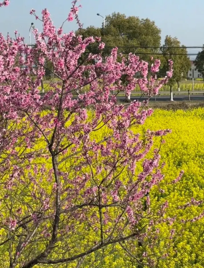 沿途桃花灼灼,粉云缀满枝头,与漫野金黄的油菜花撞个满怀;垂柳依依,新绿垂落,风里全是春天的温柔。
