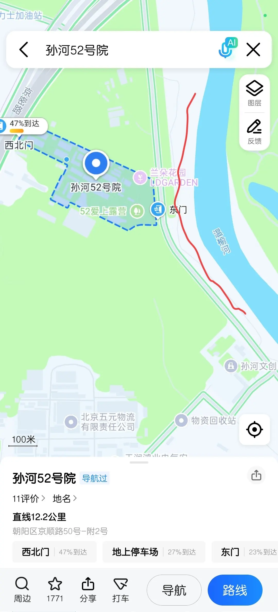 具体的坐标位置可以导航孙河52号院东门,园区内部道路有点窄,最好走园区外面过来~河边都是开放的公园,附近也有卫生间,停车🅿️可以在路边靠边停,周末有保安指引~