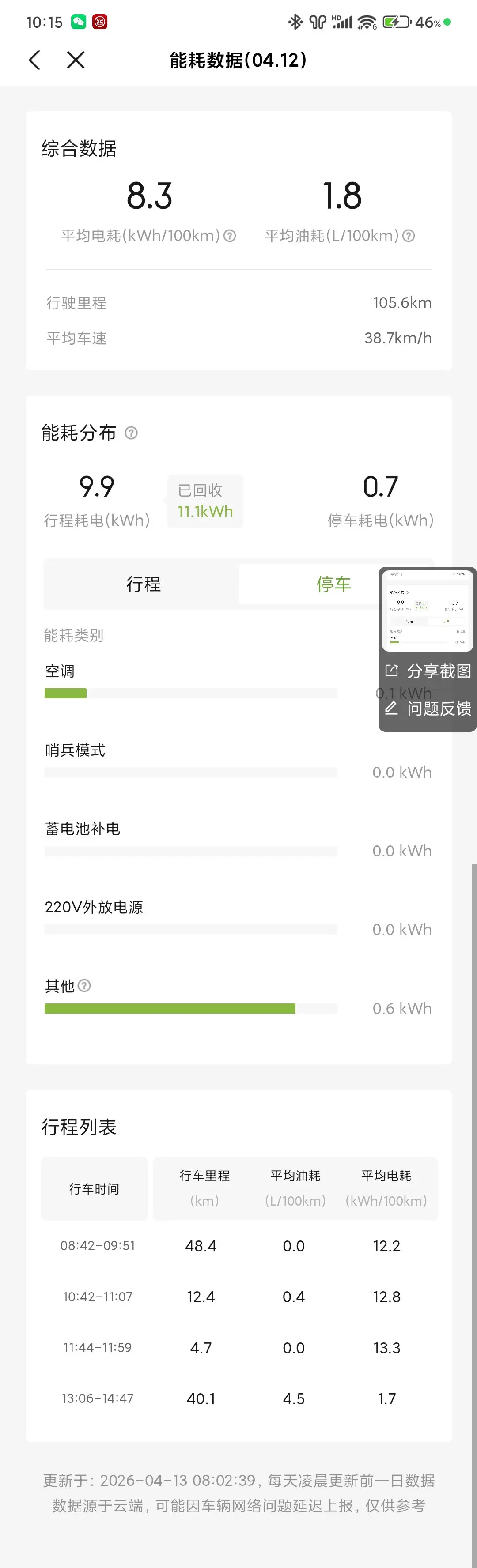 车的电耗控制的也很好,平均在14度左右,大大超出预期,现在就等天冷了看看低温的表现了。不过我是增程我不怕纯电续航低