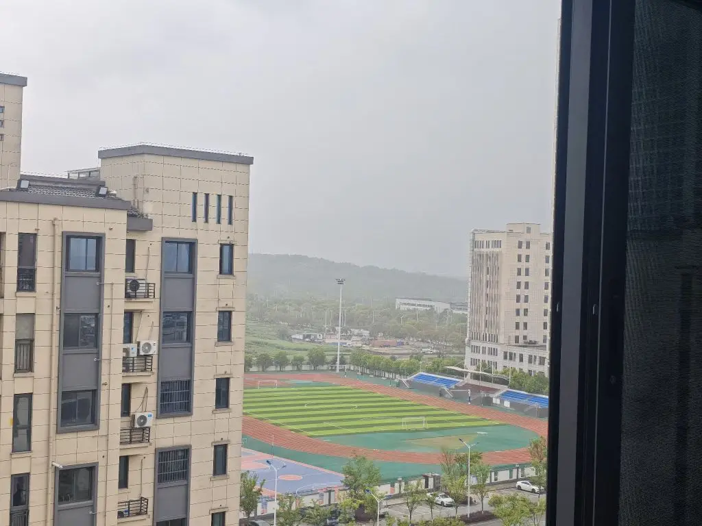 🌹🌹🌹阳台窗户前是一所初中,红绿相间的操场、红蓝相间的篮球场无不萌动着青春的气息。虽然是中午没有学生在操场运动,但掩盖不住“年轻真好”“学生时代的美好”