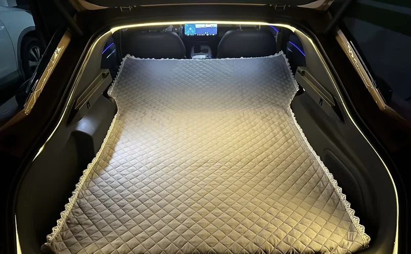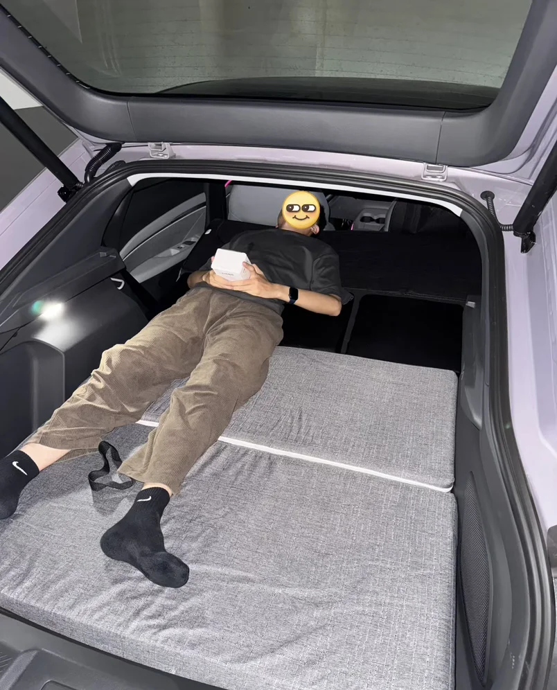 2、后排宽敞不局促,放倒座椅秒变 1752L 超大储物舱,双人床可以躺平,需要一个充气床垫。除此之外帐篷、桌椅、炊具全装下,露营装备不妥协小鹏汽车。