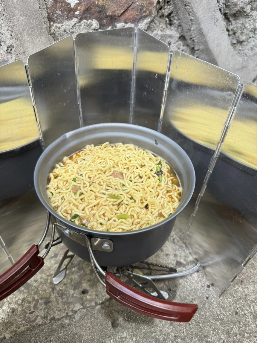 一路上大家说说笑笑,脚步轻快,全然没有平日里的疲惫。行至中途,找一处平坦的地方停下,就地架起炊具煮上一锅热气腾腾的泡面,简单的食物在山野间吃起来格外香甜。