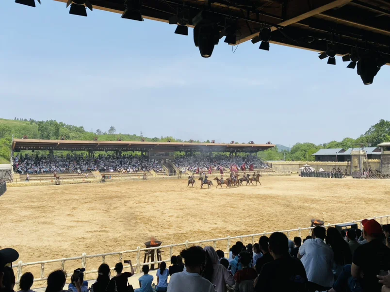 逛累了正好赶上《云中战歌》马战表演,那叫一个热血沸腾!古色古香的战场、策马奔腾的演员、刀光剑影的特效,坐在看台上吹着风看全场,感觉自己像穿越到了古代战场,比看电影还带劲。