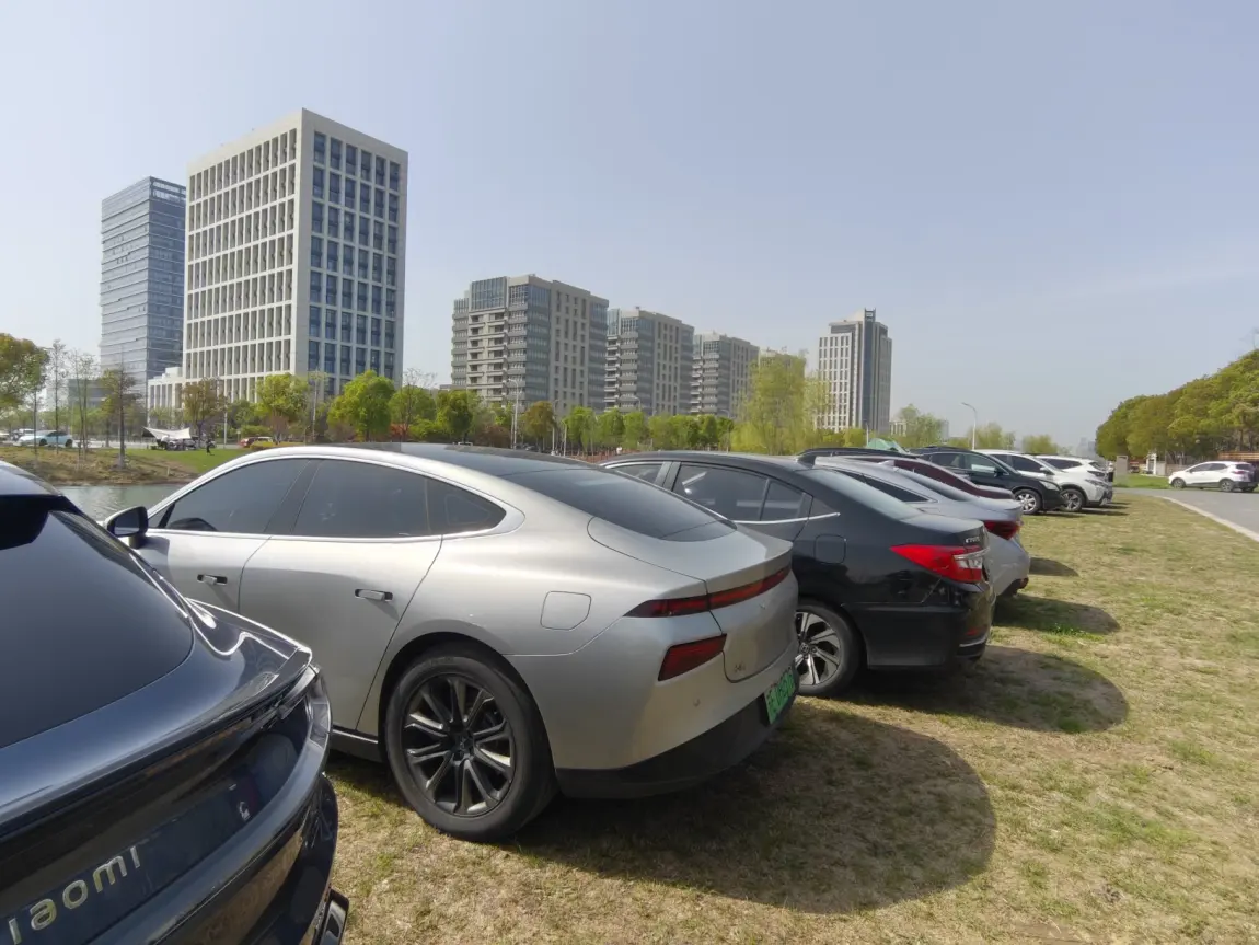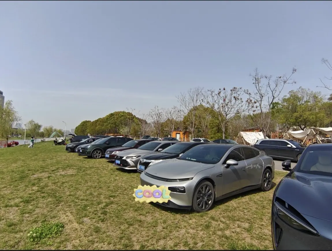 把佩奇停在河边的草坪上,远看一长条的车,满满当当,都是来采风的,带娃的居多啊。