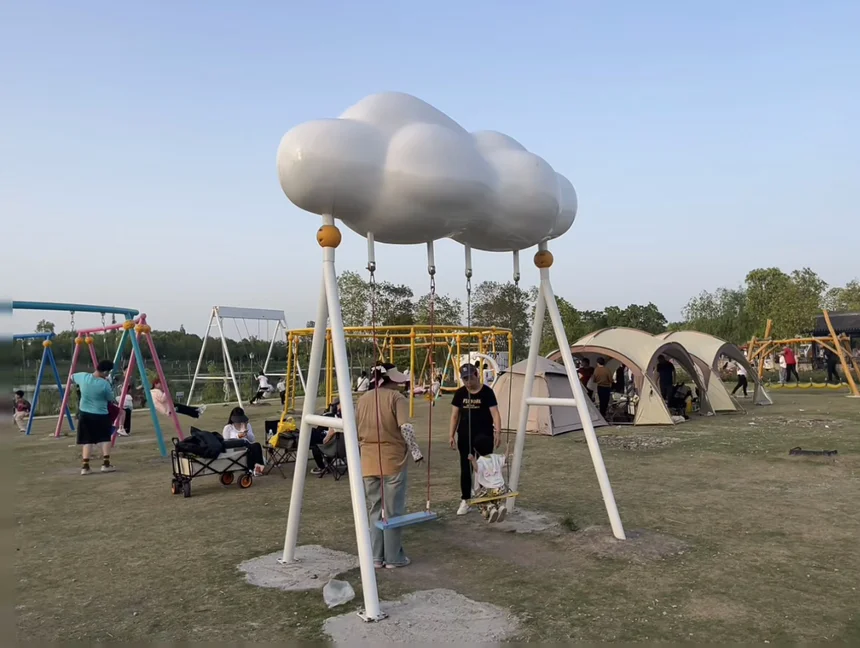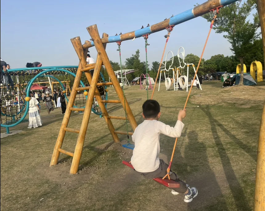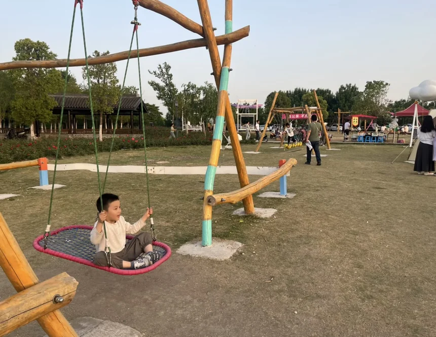 名为“千秋驿”的区域,是当之无愧的快乐制造机。这里秋千遍布,单人荡、双人荡,属于孩子们最爱的乐园。